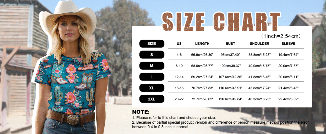 • Material and Size: S=US(4-6), M=US(8-10), L=US(12-14), XL=US(16), XXL=US(18-20).Vintage Western 3D Digital printing T-Shirt made of high-quality Polyester , not”embroidery”,but comfortable, skin friendly, keeping you comfortable all day long.