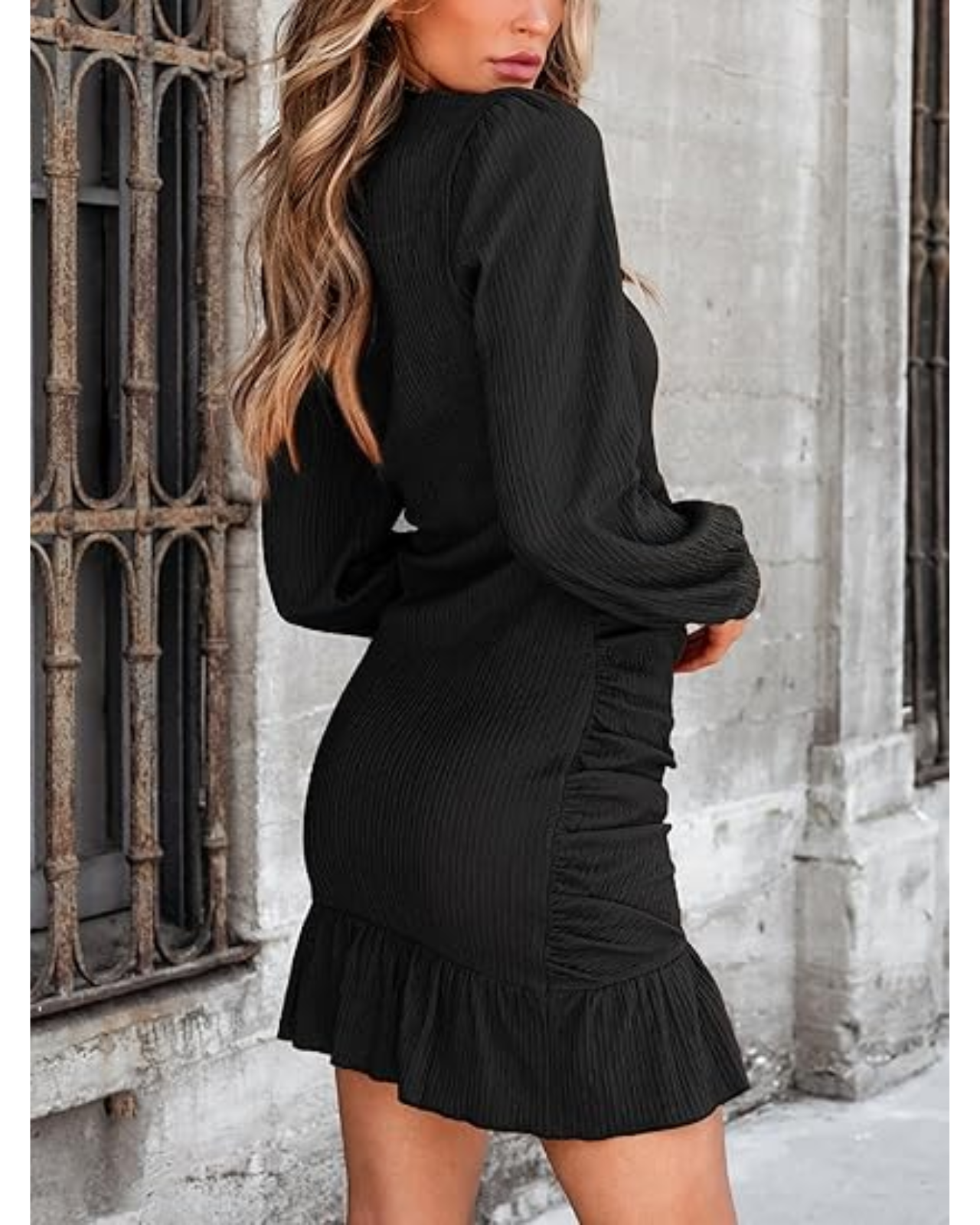 - This long sleeve dress features a mini length, round neckline, ruched bodycon design, irregular ruffled hem modified body lines, high waist holiday dresses for women.