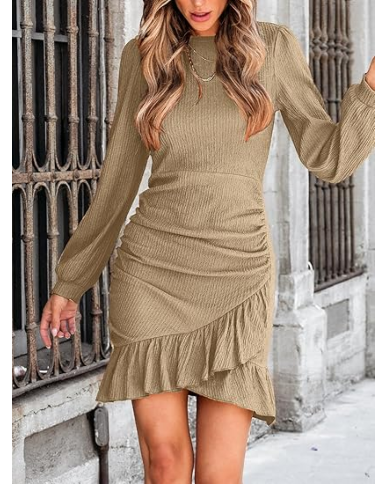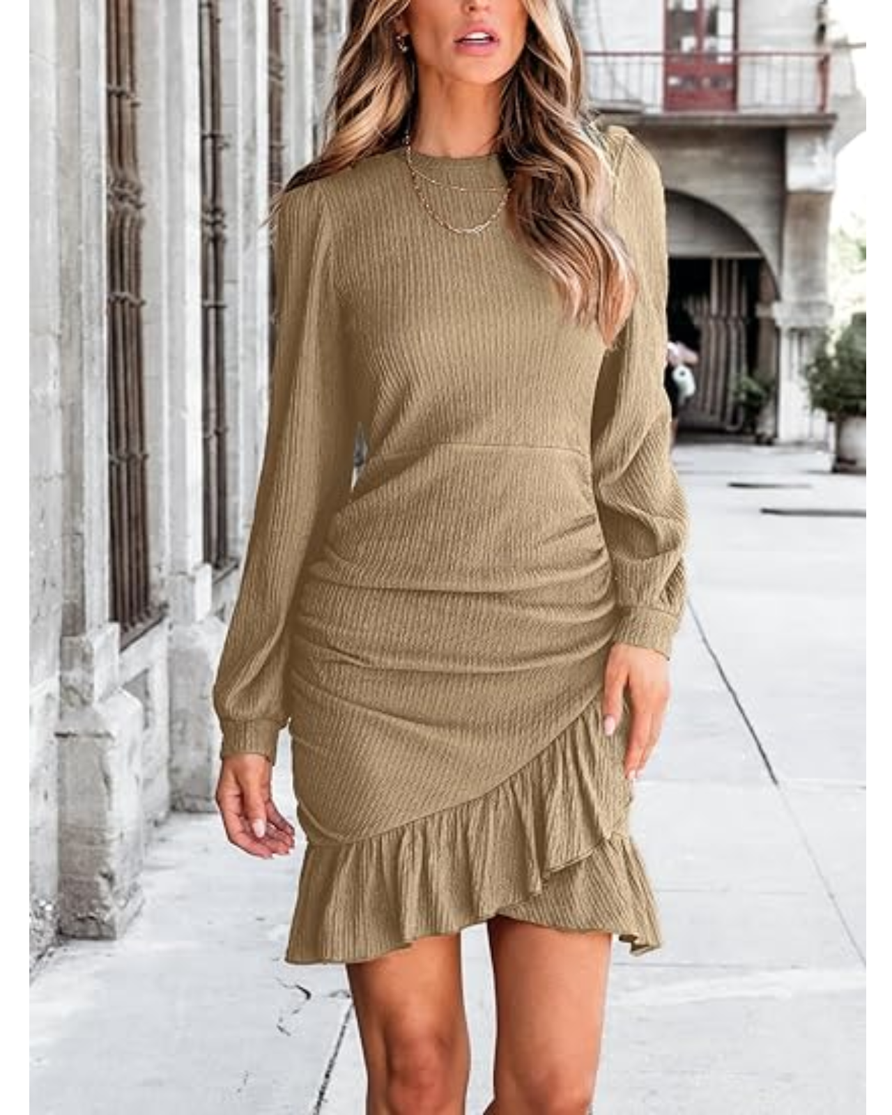 CUPSHE Women Knit Ruched Fall Dress Khaki Smocked Ruffle Hem Crew Neck Long Sleeve Bodycon Sexy Casual Holiday Mini Dress