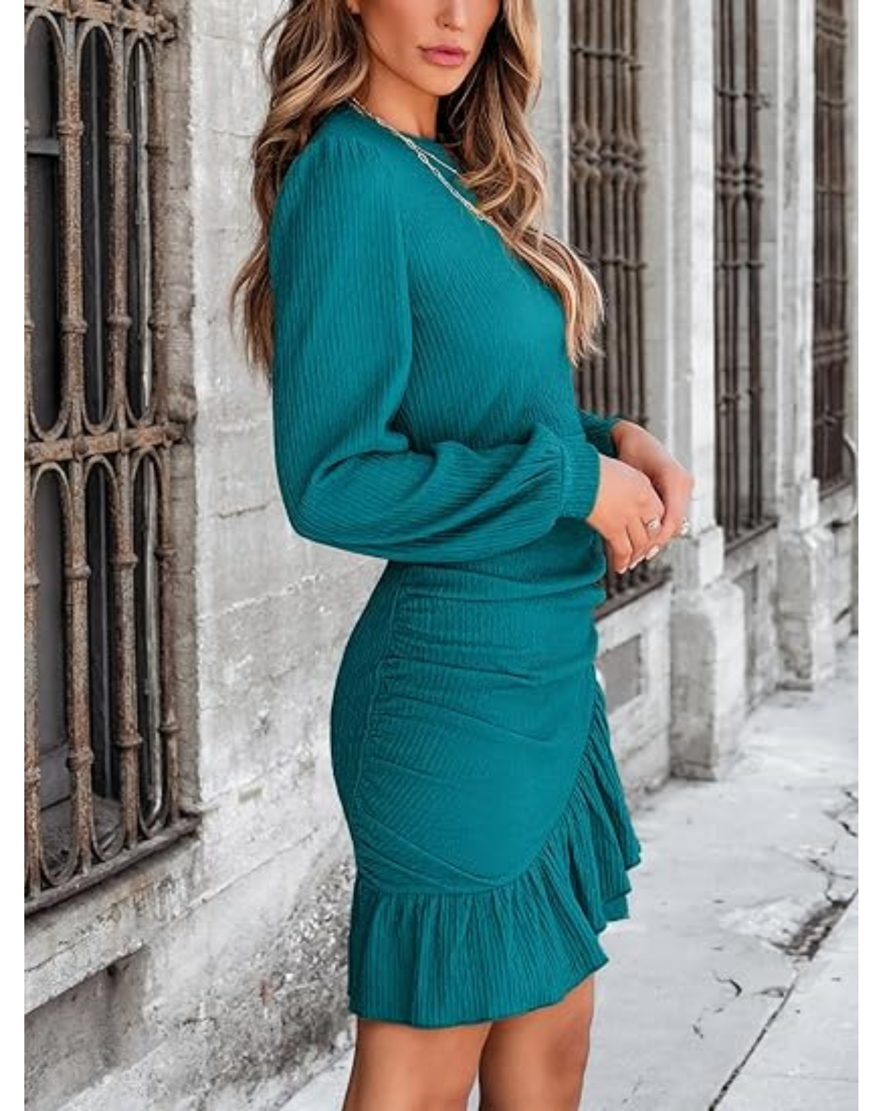 CUPSHE Women Knit Ruched Fall Dress Teal Smocked Ruffle Hem Crew Neck Long Sleeve Bodycon Sexy Casual Holiday Mini Dress