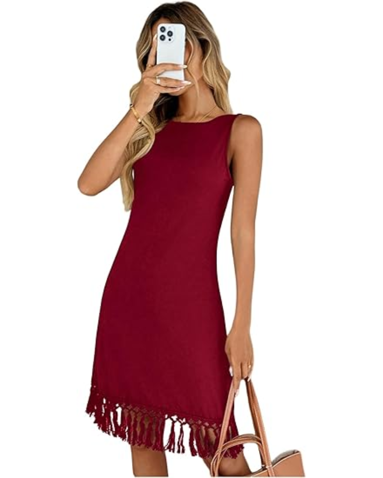 Verdusa Women’s Western Fringe Tank Dresses Dark Burgundy Sleeveless Short Summer Dress