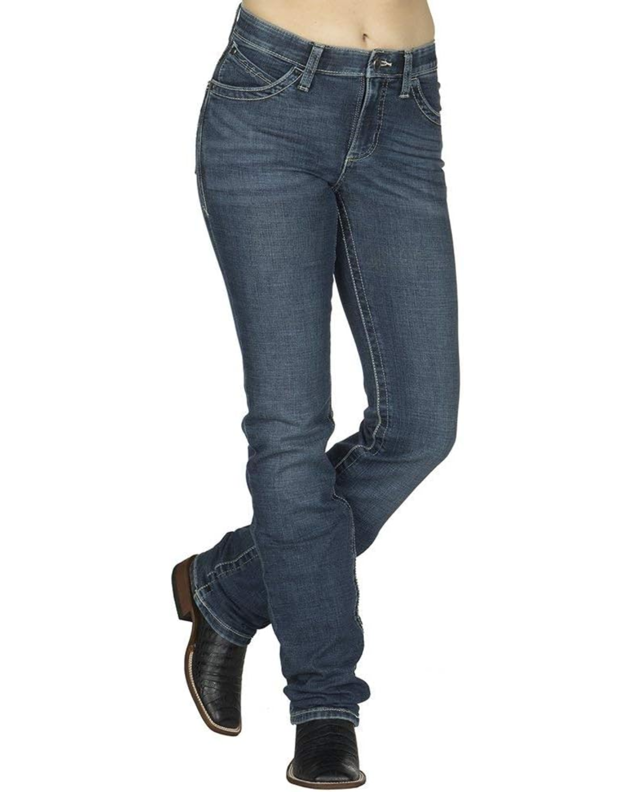 - PERFORMANCE FIT. This mid rise jean sits above the hip — designed with a no-gap waistband with a higher back and a lower front for full coverage and comfort while riding. This jean is fitted through the seat and thigh and built to fit over your favorite pair of boots.